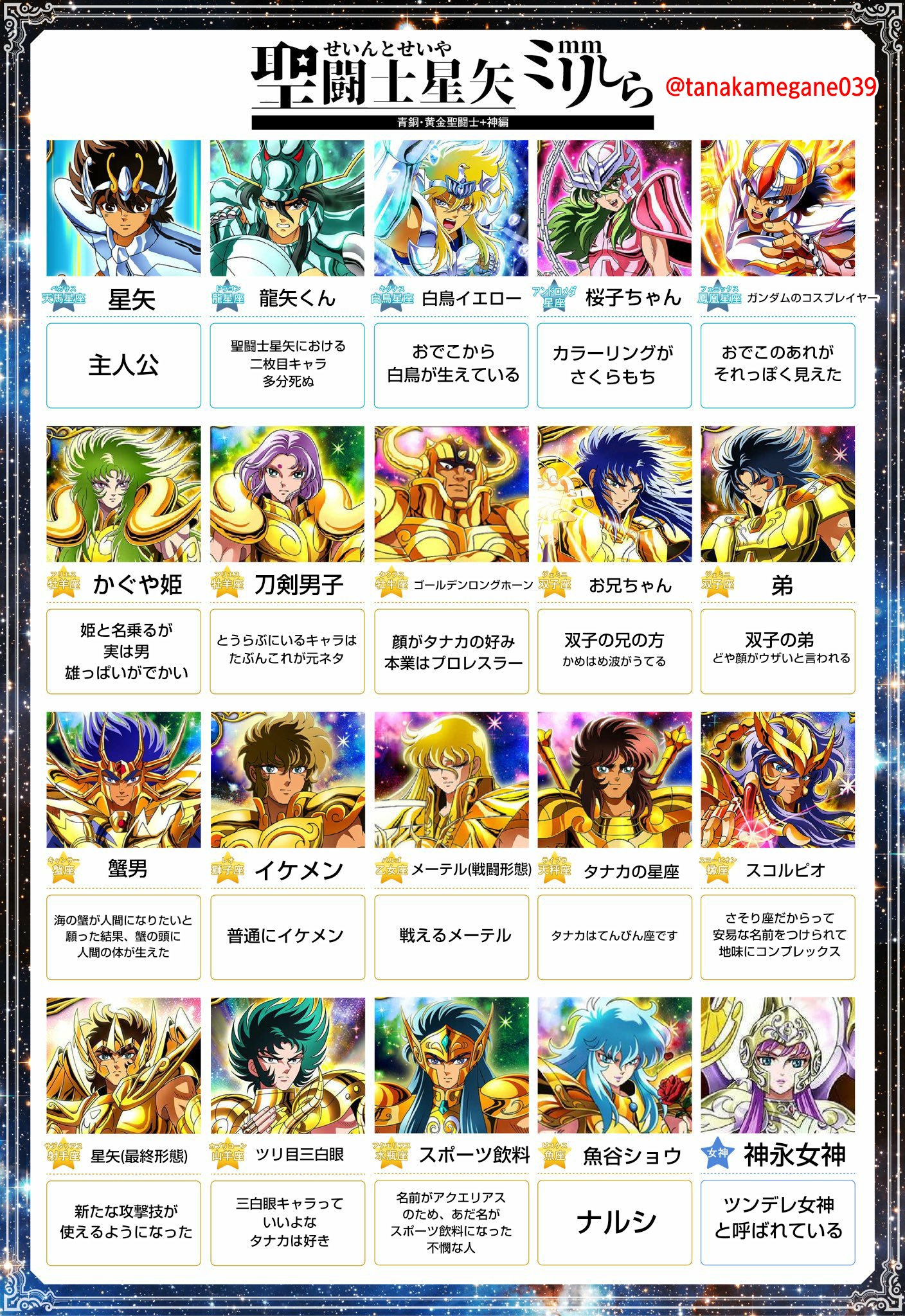Tanakamegane墓参り3 11 12 聖闘士星矢ミリしらもやってみました さっきやった北斗の拳ミリしらと違って 本当にキャラも名前も設定も知らないのでだいぶカオスになりました T Co S8fiqczltd Twitter